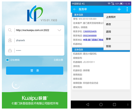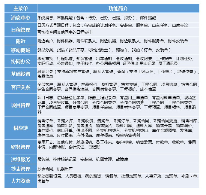 移動服務(wù)接單、機器二維碼掃描、手機拍照定位、機器新增查詢、耗材查詢、客戶新增查詢、實時庫存查詢、知識庫查詢、應(yīng)收款及對帳、移動辦公及審批等;