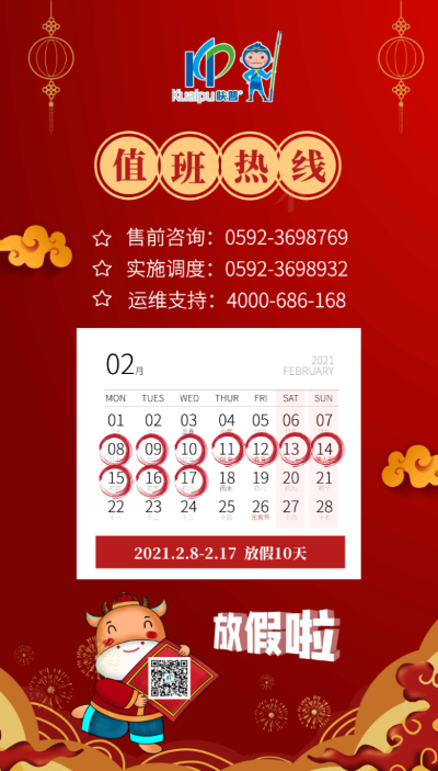 值此春節(jié)來(lái)臨之際,根據(jù)《國(guó)務(wù)院辦公廳公布2021年春節(jié)放假安排》,結(jié)合公司實(shí)際情況與工作安排,現(xiàn)將我司春節(jié)放假安排如下: